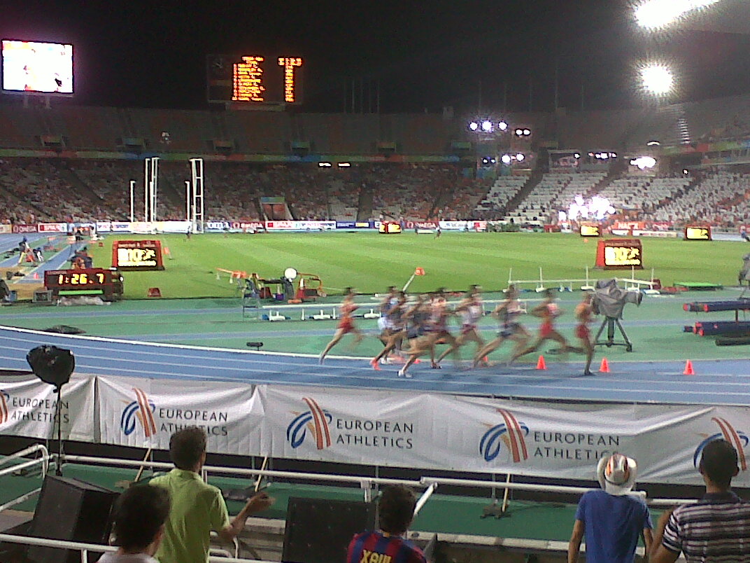 Li confessaba Pablo Villalobos a Pol Guillén, el passat divendres devant de la porta 8 de l'Estadi Olímpic, que es trobaba bé, que tenia bones vibracions i molta confiança de cara a la marató de diumenge a les 10h. Suposo que tots deuen pensar i/o dir gairebé el mateix quan es troben devant d'una competició de primer nivell, no?. En qualsevol cas Pablo no ens va enganyar, i va completar una marató sensacional, de menys a més, i finalitzant en cinquena posició, just per devant de Rafa Iglesias, un altre que representa el millor relleu de Chema Martinez pels propers anys. Un relleu que de moment no es del tot efectiu, perque un cop més Chema ha estat el millor dels espanyols. Segon a la línia de meta, ha fet tota una demostració de talent, força, cap, i experiència. Nacho Caceres i Pepe Rios no han tingut el seu dia, i han optat per la retirada. La marató la vaig seguir per TV, però en canvi la final dels 1.500 m. de divendres si que la vaig poder gaudir en directe, (al costat d'uns familiars de l'atleta Marta Domiguez, per cert). Sempre es espectacular una final de 1.500, i amb espanyols de favorits encara més. Al final no va guanyar el més favorit de tots, però l'autoritat de la victoria d' Arturo Casado va ser total. Bronze per Manuel Olmedo, i 4º lloc, (medalla de xocolata), per l'incombustible Reyes Estévez. L'Estadi Olímpic LLuis Companys no es va omplir del tot. Crec que cap dia a arribat a omplirse completament. Pot ser no ens acaba d'enganxar això de veure una bona colla de "sonats" corrents al voltant d'una pista de tartan. I no, segurament no tenim la cultura i gran tradició atlètica d'altres paisos, però em va cridar l'atenció el percentatge de públic estranger que poblaven la grada. Jo diria que majoria. Gran ambient, si, però va faltar allò "d'omplir fins a la bandera". No tenim uns campionats d'Europa cada any!. Ah, i disculpeu la baixa qualitat de les fotos. Estan fetes amb mòbil.